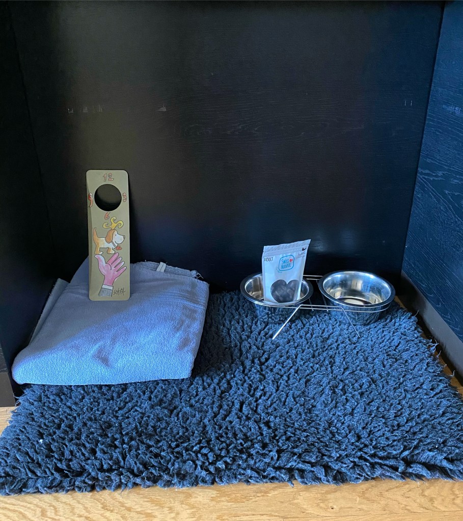 They love dogs! Just look at what awaited me in our room: A bed, treats, Bowls and a towel to clean my paws. Even a sign to put on the door not to disturb if I’m alone in the room.