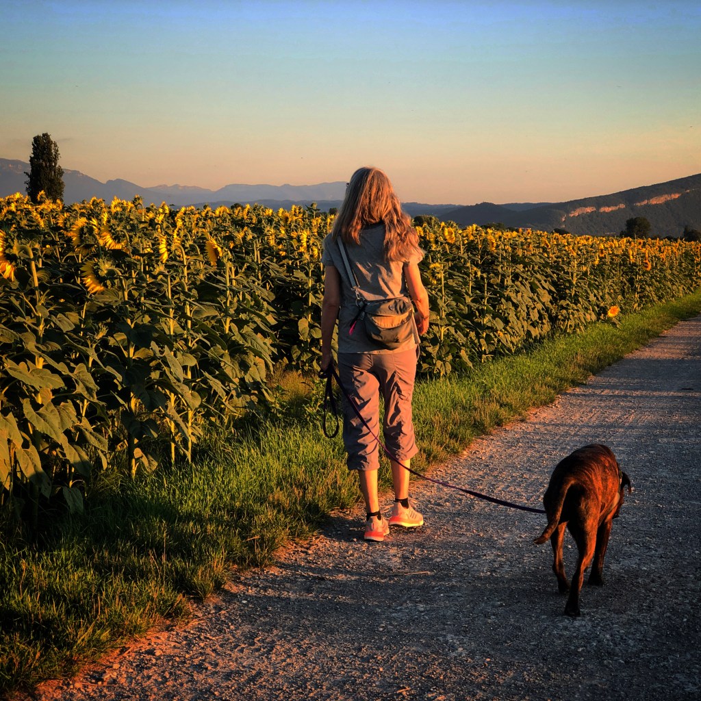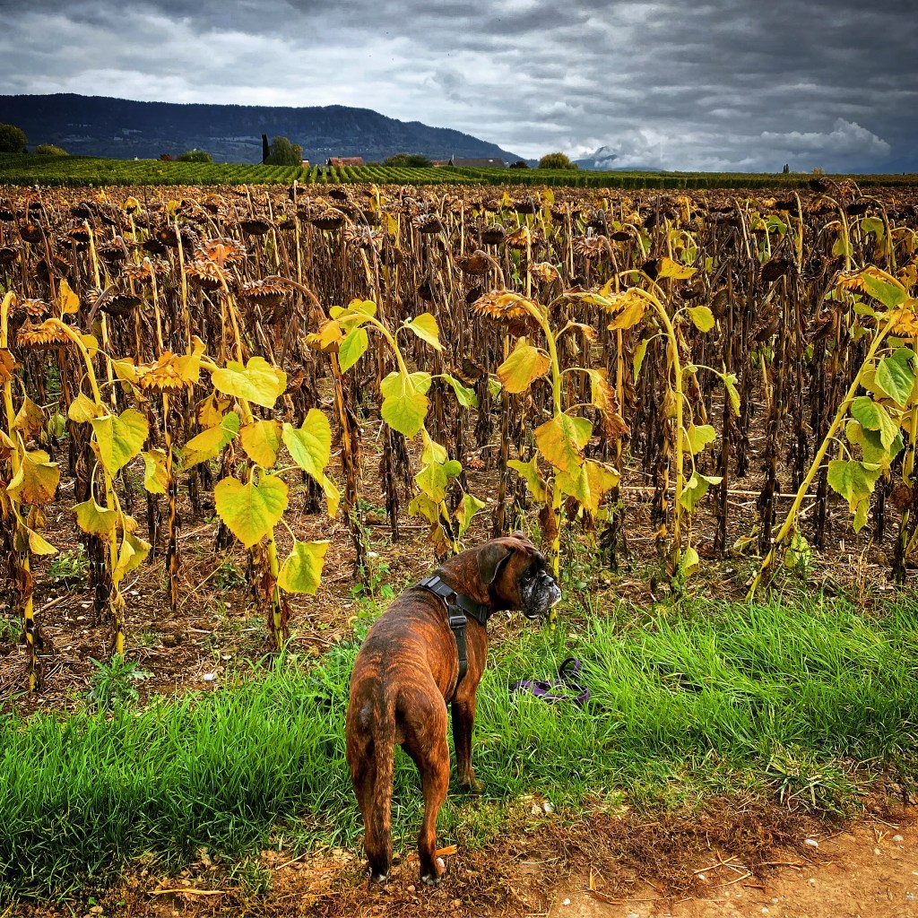 Nature is gorgeous, take time to admire this beautiful faded sunflower field. (And of course, the pretty Boxer girl posing up front)